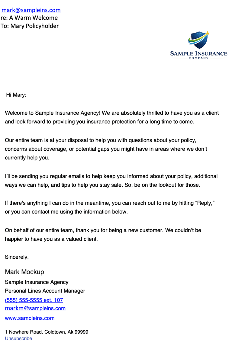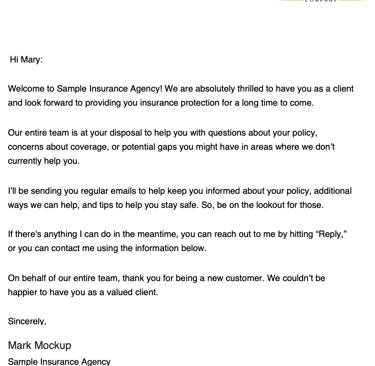 Welcome to Sample Insurance Agency! We are absolutely thrilled to have you as a client and look forward to providing you insurance protection for a long time to come.